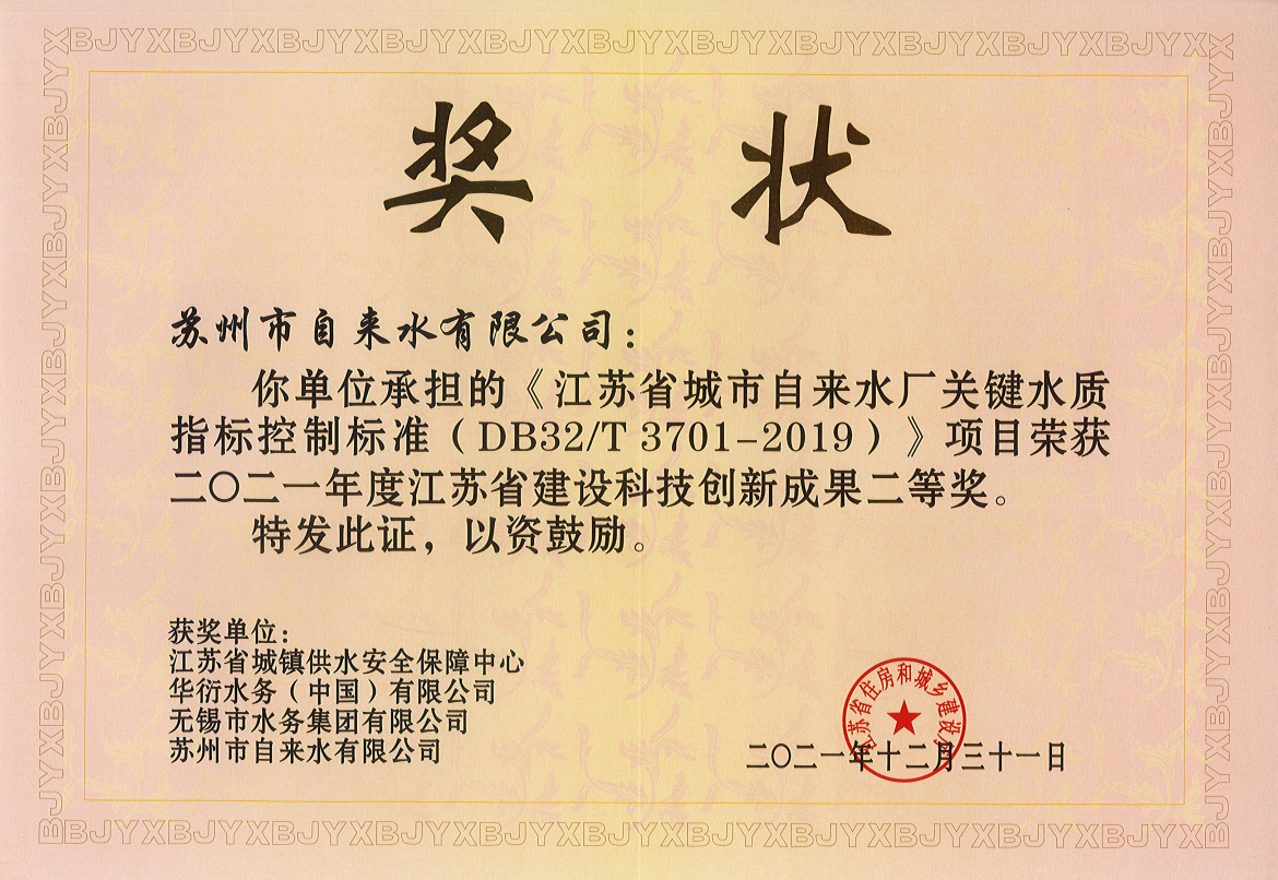 近日,由省供水中心主编、市自来水公司参编的技术成果《江苏省城市自来水厂关键水质指标控制标准》(DB32∕T 3701-2019)(以下简称《标准》)荣获2021年度江苏省建设科技创新成果二等奖。