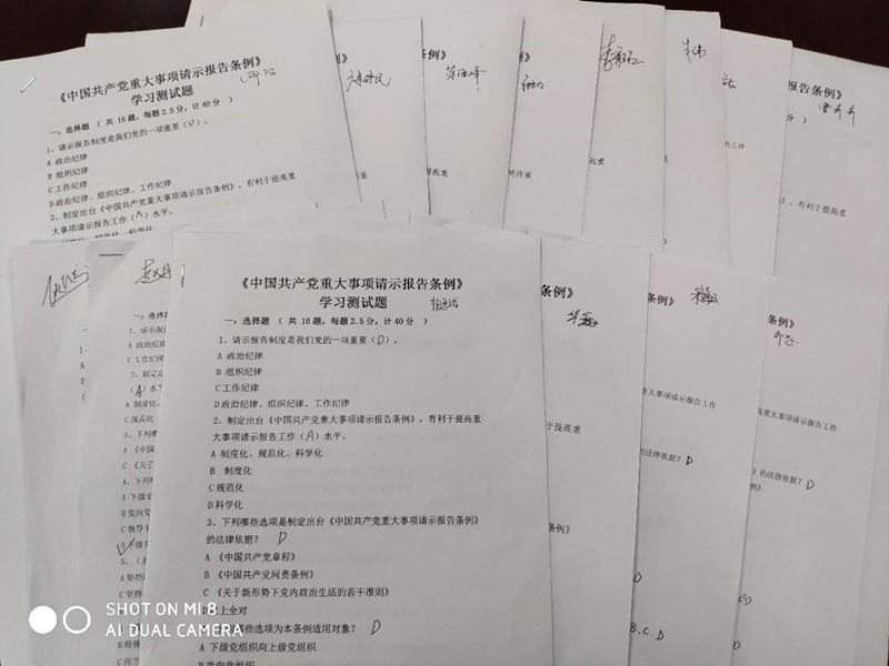 会上,党支部书记强调,请示报告制度是党的一项重要政治纪律、组织纪律、工作纪律,是执行民主集中制的有效工作机制。党中央制定出台《条例》,有利于推动全党上下更加坚决地贯彻执行这项重大制度,进一步提高请示报告工作制度化、规范化、科学化水平。随后,每位党员认真完成公司下发的《条例》学习测试题,检验学习成果。