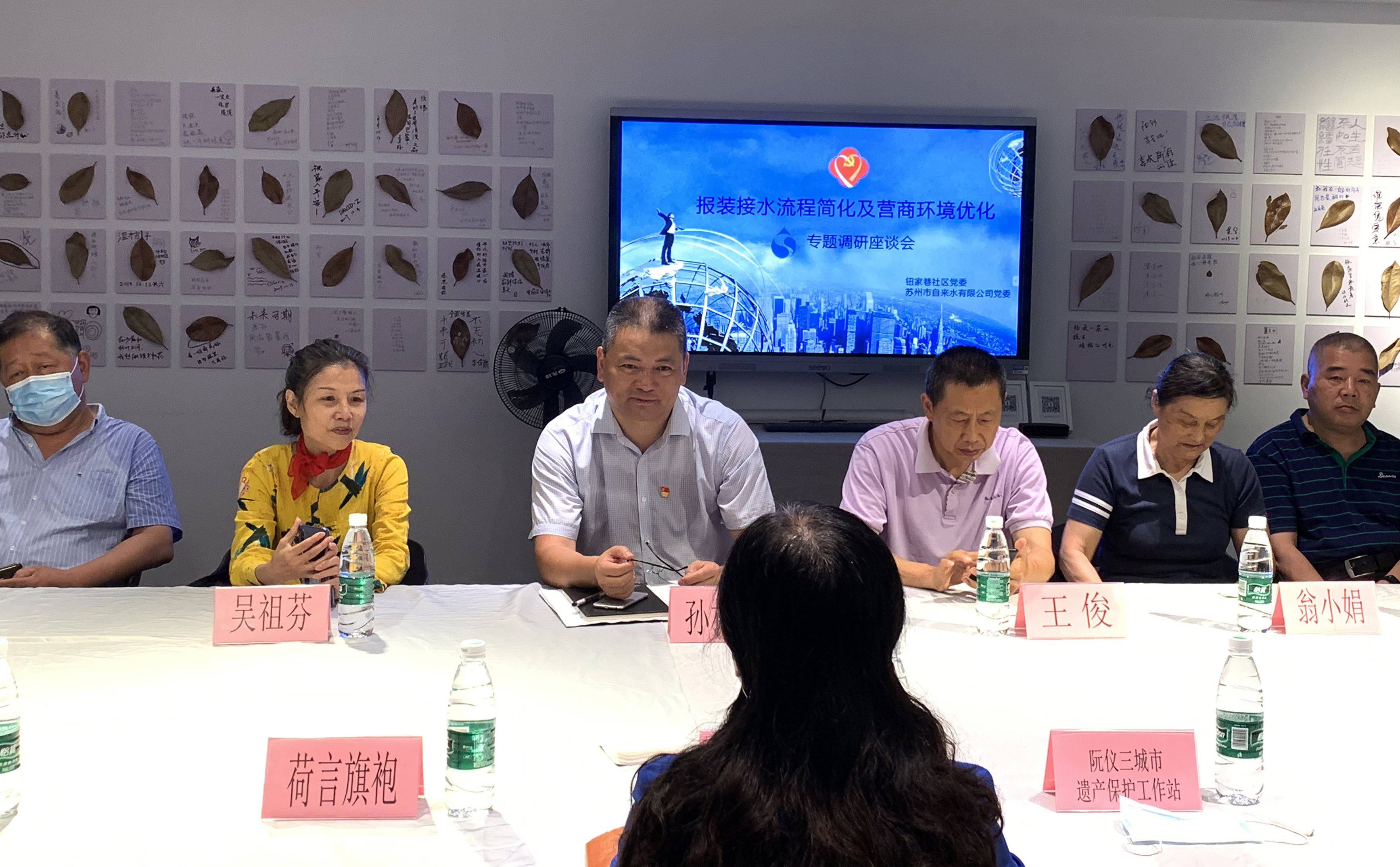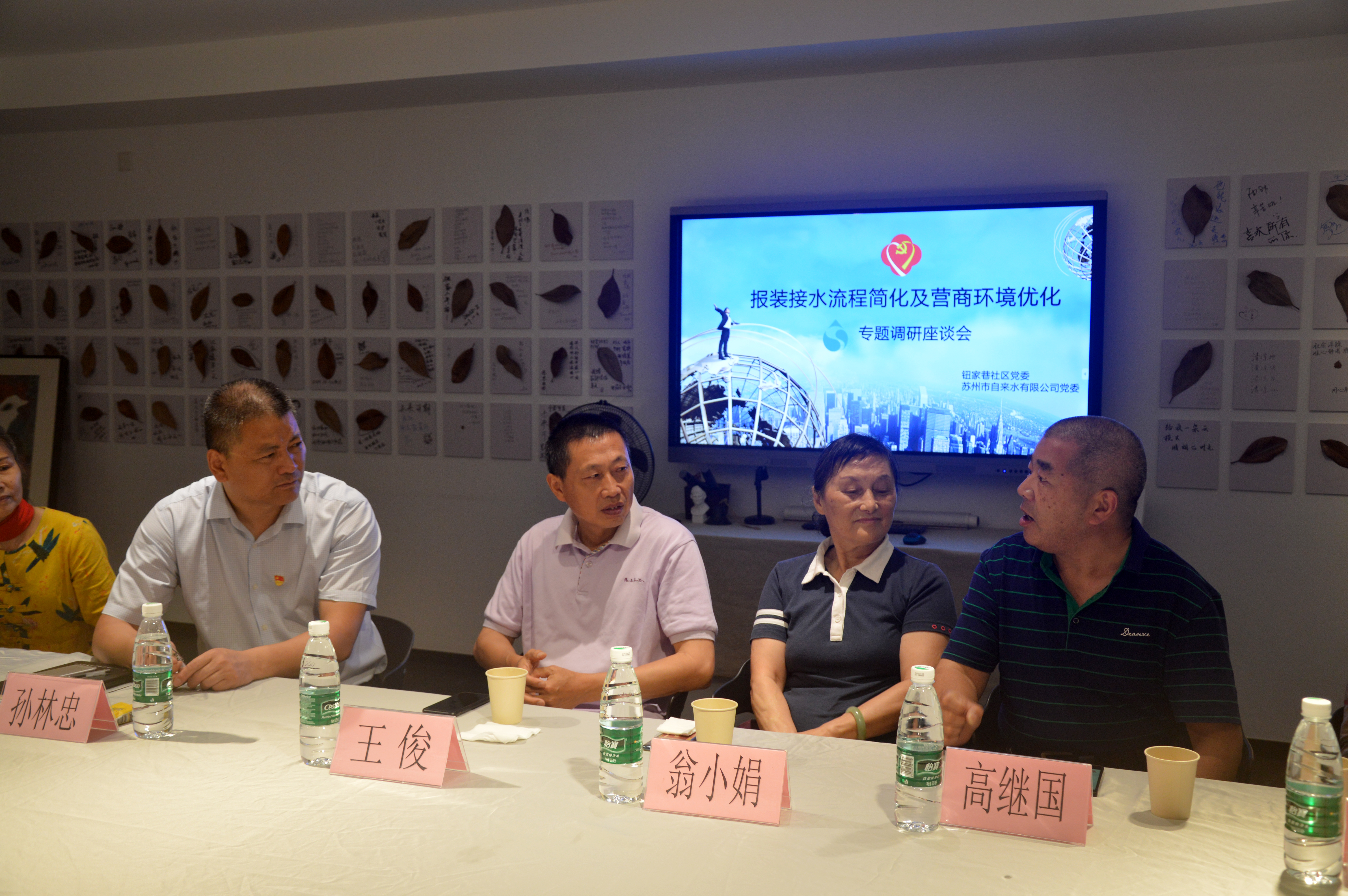 座谈会上,孙林忠书记与江苏省城市足球赛官网大都物业、江苏省城市足球赛官网观璟房产有限公司、荷言旗袍等七家商户及凤池弄8户居民代表,就社区普遍关心的供用水生产、服务工作进行了深入交流,详细听取了与会代表对公司社区服务网格化管理、报装接水流程优化、消火栓结对管理等方面的意见和建议。会后,孙林忠书记现场走访了沿街多个商户,实地了解社区居民反映的用水难题,并对解决方案做出具体部署。