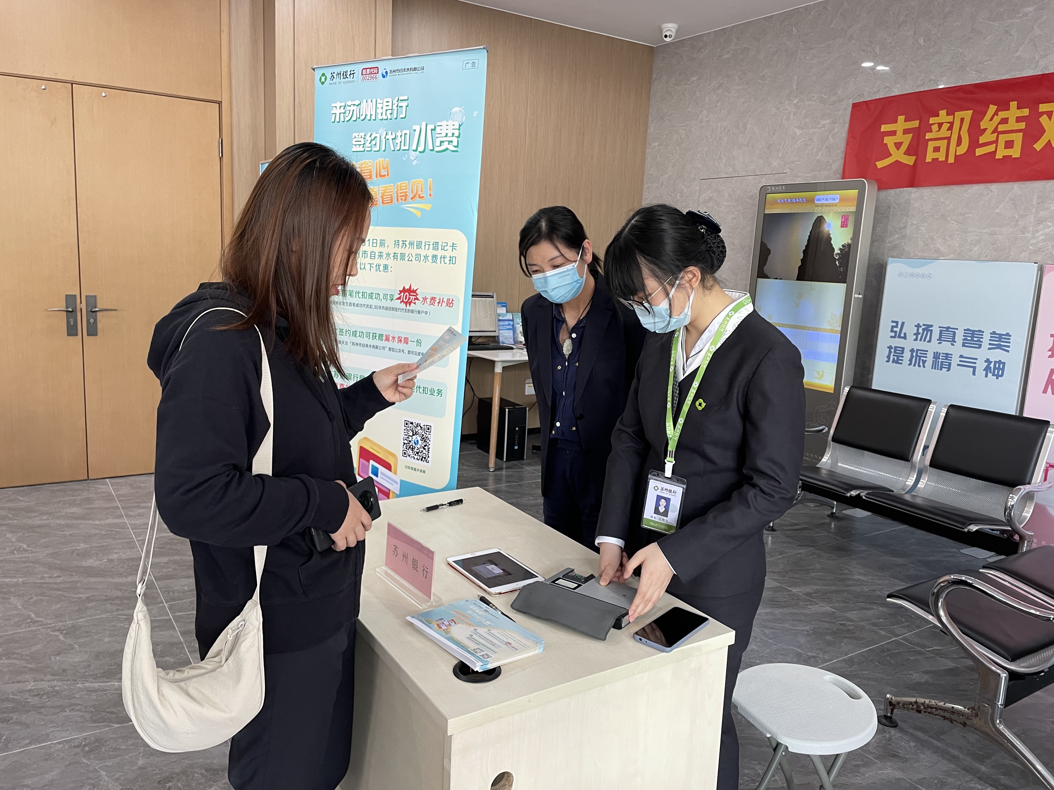 10月中旬,公司供水管网所、供水营业所联合党支部与州银行湖东党支部签订《党建共建协议书》,确立党建共建关系。双方介绍了各自的业务特点、便民服务举措与特色党建内容,现场开展了首次合作营销项目——“签约代扣水费业务”,承诺为用水客户提供“首单返现10元,赠送漏水保障”的福利。前来营业厅办理业务的用户也纷纷被吸引,拿起手机按照操作指引进行实名认证、绑定银行卡,顺利开通“代扣水费”业务。
