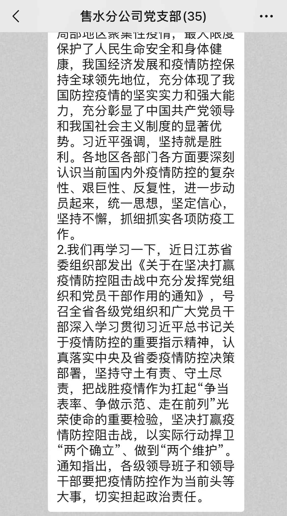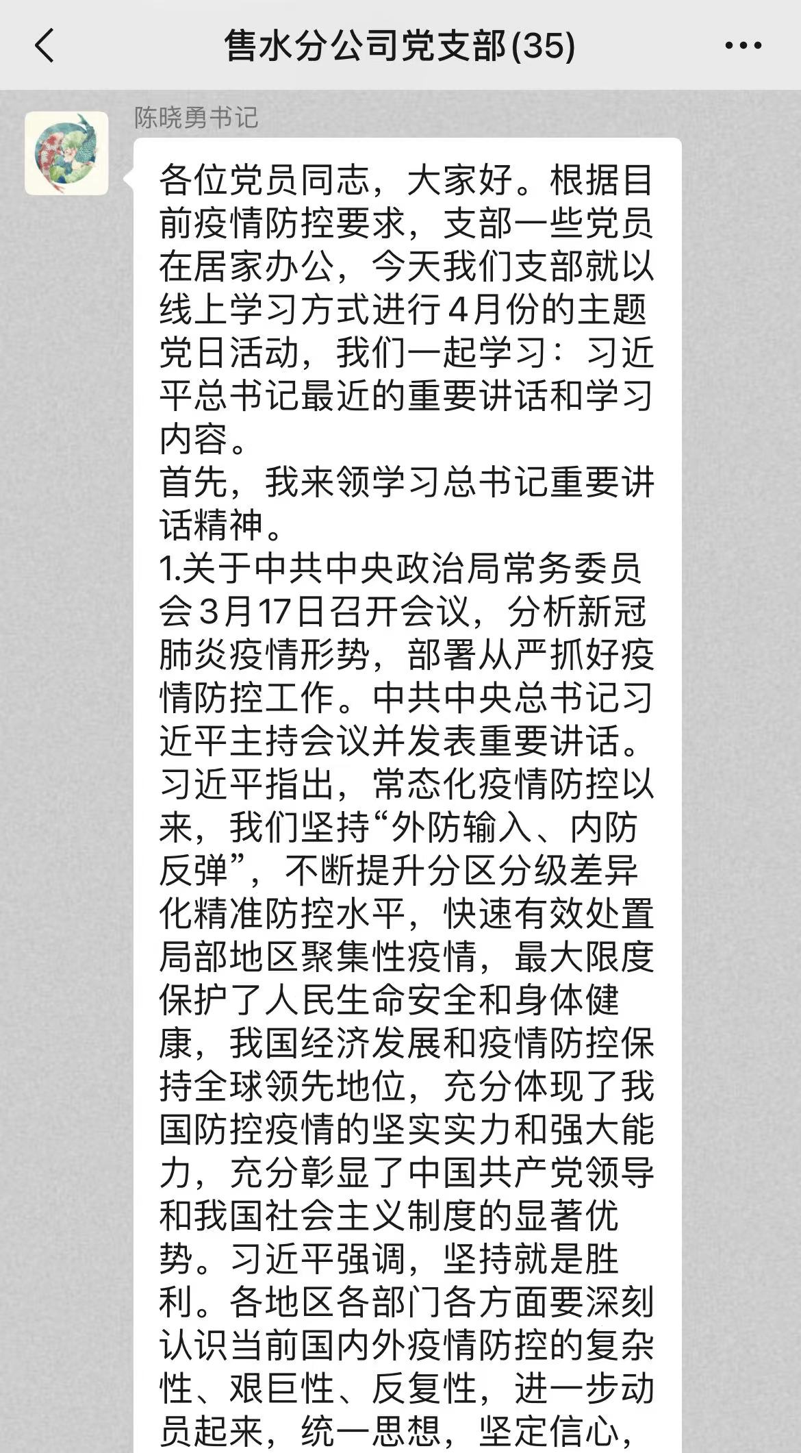 售水分公司党支部依托微信平台,组织支部全体党员结合习总书记《分析新冠肺炎疫情形势,部署从严抓好疫情防控工作》重要讲话精神,交流近期值班工作及防疫志愿服务开展情况。党员们一致表示,将坚决贯彻党中央关于疫情防控工作的重要指示,严格落实AB岗值班制度、抢修人员24小时封闭管理,从细、从实抓好中心疫情防控工作,为夺取疫情防控和供水平稳运行“双胜利”贡献党员力量。
