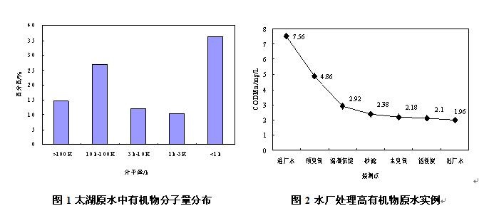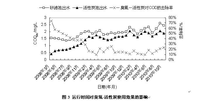 图1为太湖原水有机物分子量分布情况。可知原水中以小分子有机物为主,分子量小于10k的占58%。常规工艺对小分子有机物的去除效果有限,因此增设了臭氧预处理和臭氧活性炭深度处理工艺是十分必要的[2]。图2为2010年1月14日,原水有机物突然升高的处理实例,可以看到虽然原水CODMn高达7.56mg/L,经过预臭氧和常规工艺后迅速降低,砂滤池出水仅为2.38mg/L,再经深度处理可以有效保证水质。表明水厂工艺对原水变化具有较强的适应性。图3为工艺长期运行情况,可以看到砂滤池出水的浓度基本上都在2.5mg/L以下,经过后续深度处理对CODMn去除,炭滤池出水基本在2mg/L以下。出厂水平均浊度<0.10NTU,表明工艺运行状况良好。藻类高发期、西塘河水源切换期间,供水区域内水质零投诉。