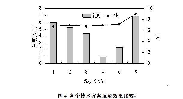 由图4可知,方案4出水浊度最低,同时pH也在理想范围内。所以确定投加聚丙烯酰胺强化硫酸铝混凝为最佳方案。另外,方案5出水浊度也比较理想,但方案6出水变差。得出可以通过投加适量的碱来调节pH值,改善混凝效果,但投量过大将导致沉后水的浊度上升且pH值也大幅度升高。生产实际中投加的聚丙烯酰胺在0.1mg/L以内,硫酸铝视原水变化而定,保证沉淀池出水浊度在1NTU以内。